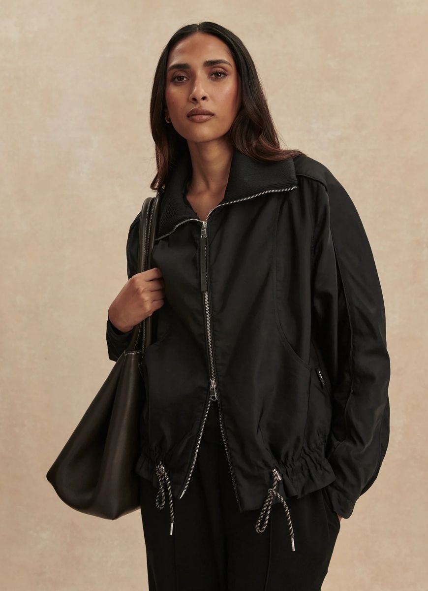 - This blouson zip-front jacket in Shimmer Twill is the perfect mix of ease and elegance. Designed for an oversized fit, it’s detailed with an exposed drawcord with ruffled trim and sleek piping along the sleeves for a subtle, stylish twist.