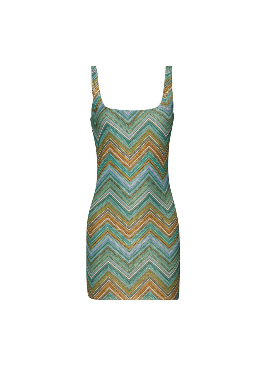 The Chevy Cora Dress is made for sunset drinks and wherever the night takes you. This curve-hugging mini features a bold, multicolour gradient chevron pattern woven with gold lurex for the perfect touch of shimmer. Flirty, sexy, and impossible to miss—this is your go-to for making an entrance.