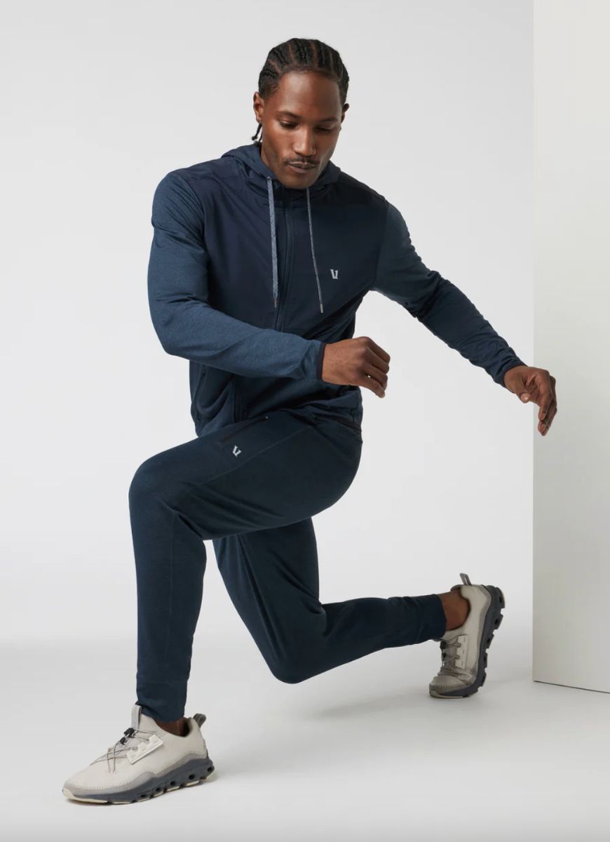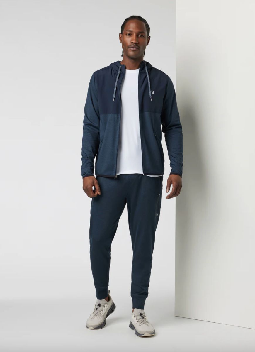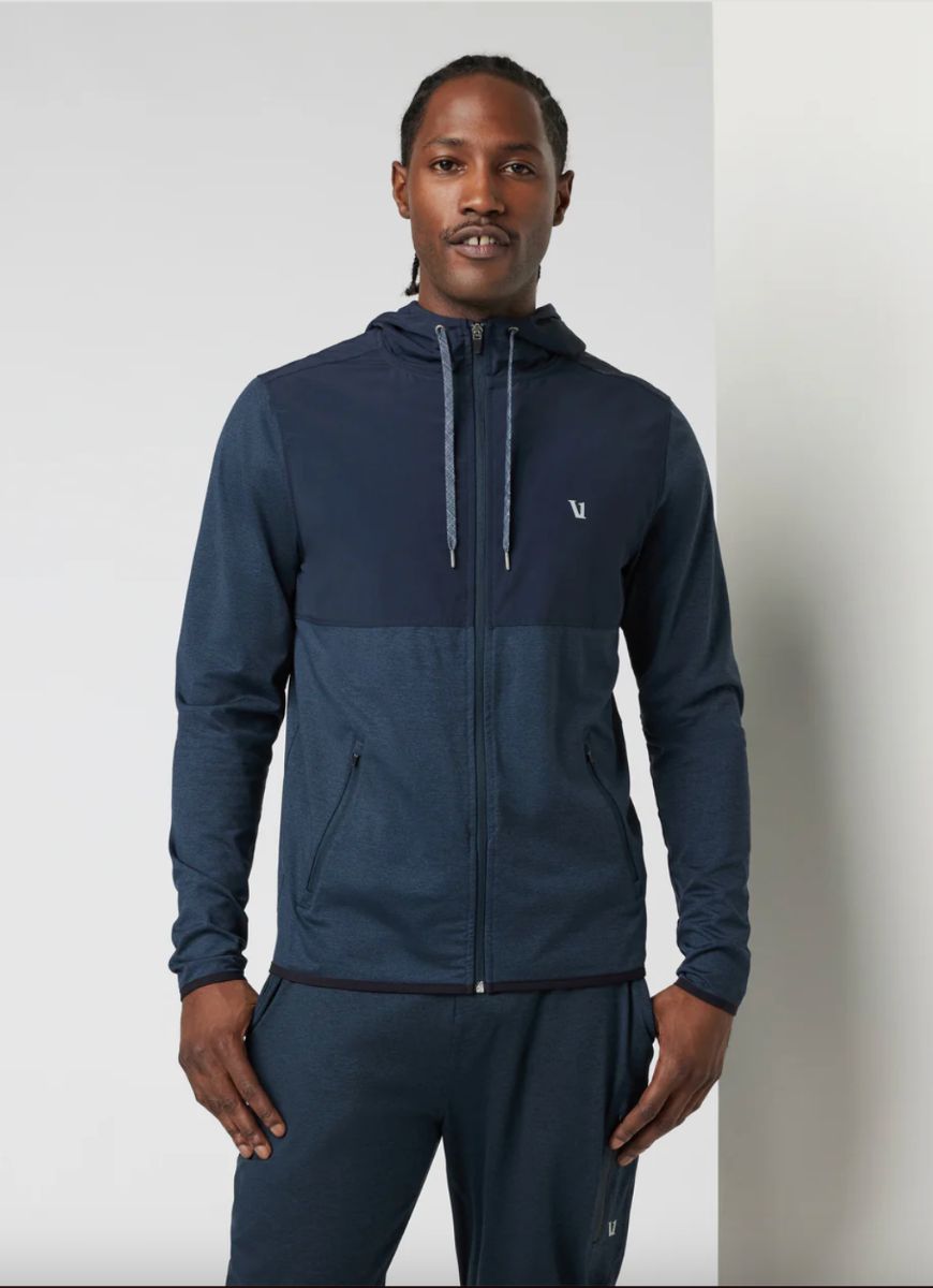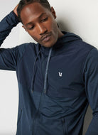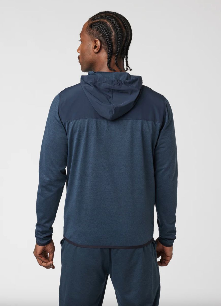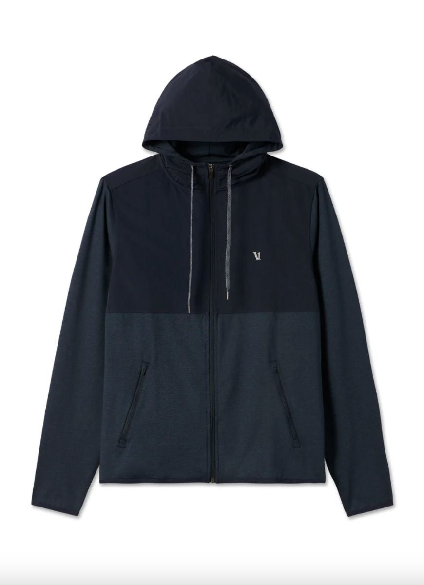 This jacket checks the boxes for both soft performance stretch knit plus a protective nylon shell from 88% recycled material to help protect from the elements. Moisture-wicking fabric along with nylon overlays, a drawcord hoodie, and zip pockets keep you in check. Great for training and running.